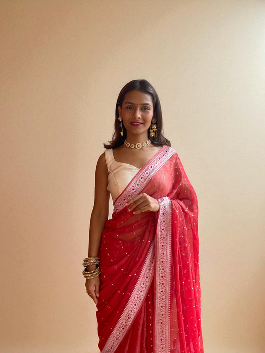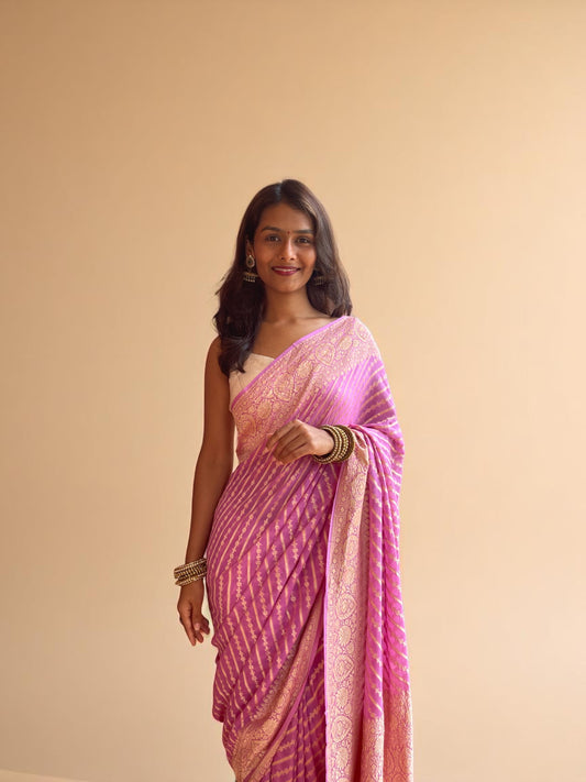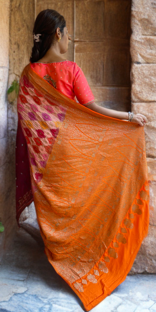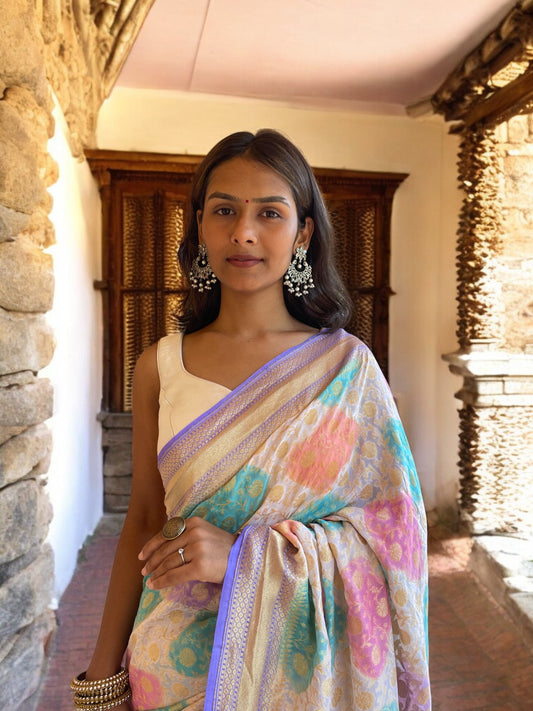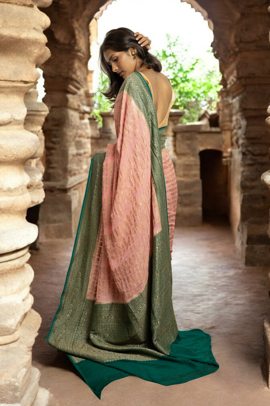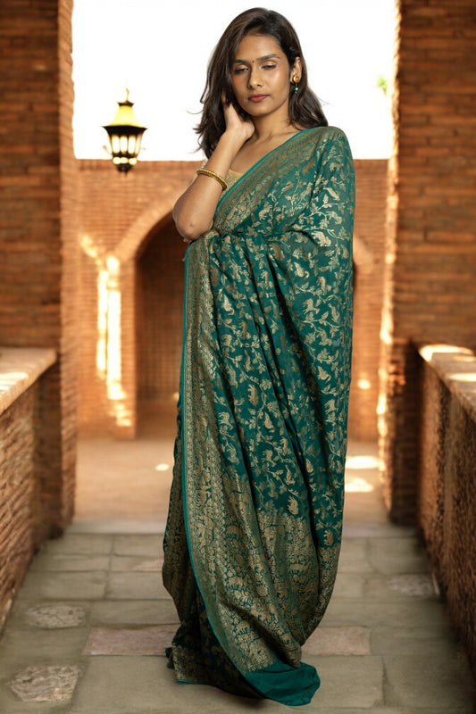 A Khaddi Georgette Banarasi saree is a handwoven masterpiece crafted from hand-spun silk yarns, creating a soft, lightweight, and slightly crinkled texture. Woven on traditional handlooms in Varanasi, it often takes 20–30 days to complete, depending on design complexity. Featuring intricate zari work, floral or Mughal motifs, and a graceful drape, it blends traditional Banarasi artistry with elegant, flowy charm—perfect for festive and formal occasions.
