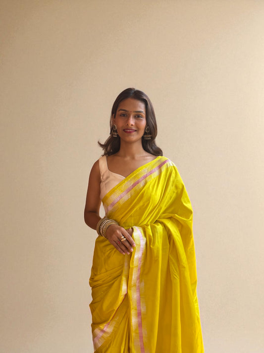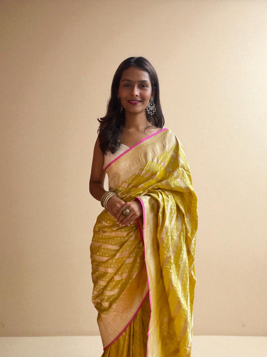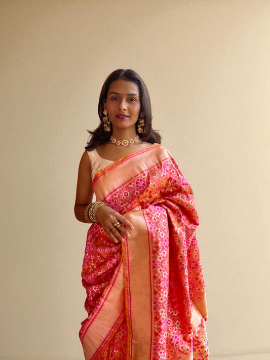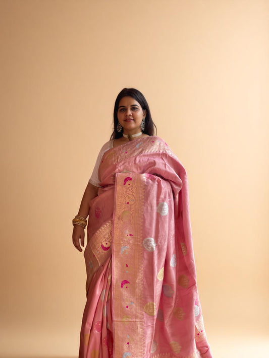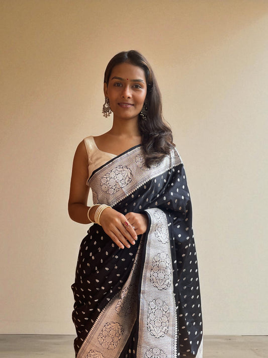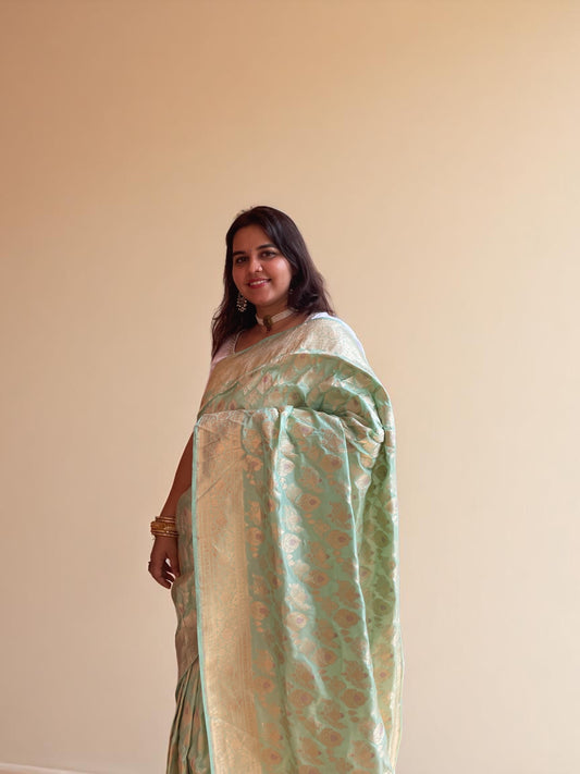 A Kataan silk Banarasi saree is woven from pure, untwisted silk threads, giving it a rich texture and lustrous finish. Crafted on traditional handlooms in Varanasi, each saree takes 30–45 days to weave, depending on the intricacy. Known for its durability, royal sheen, and detailed zari work—often with floral, jaal, or Mughal motifs—it is a timeless heirloom that embodies luxury and fine craftsmanship.