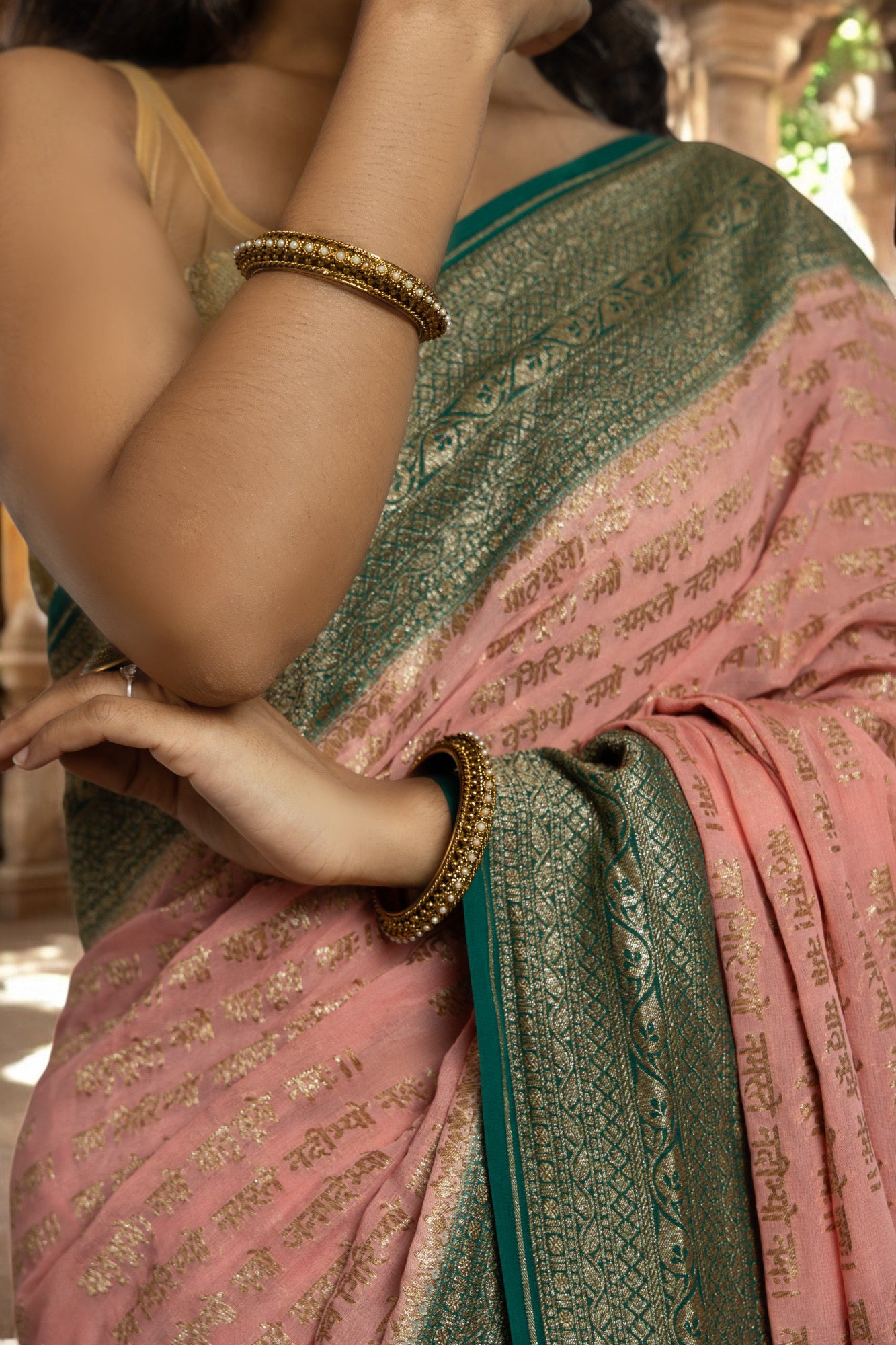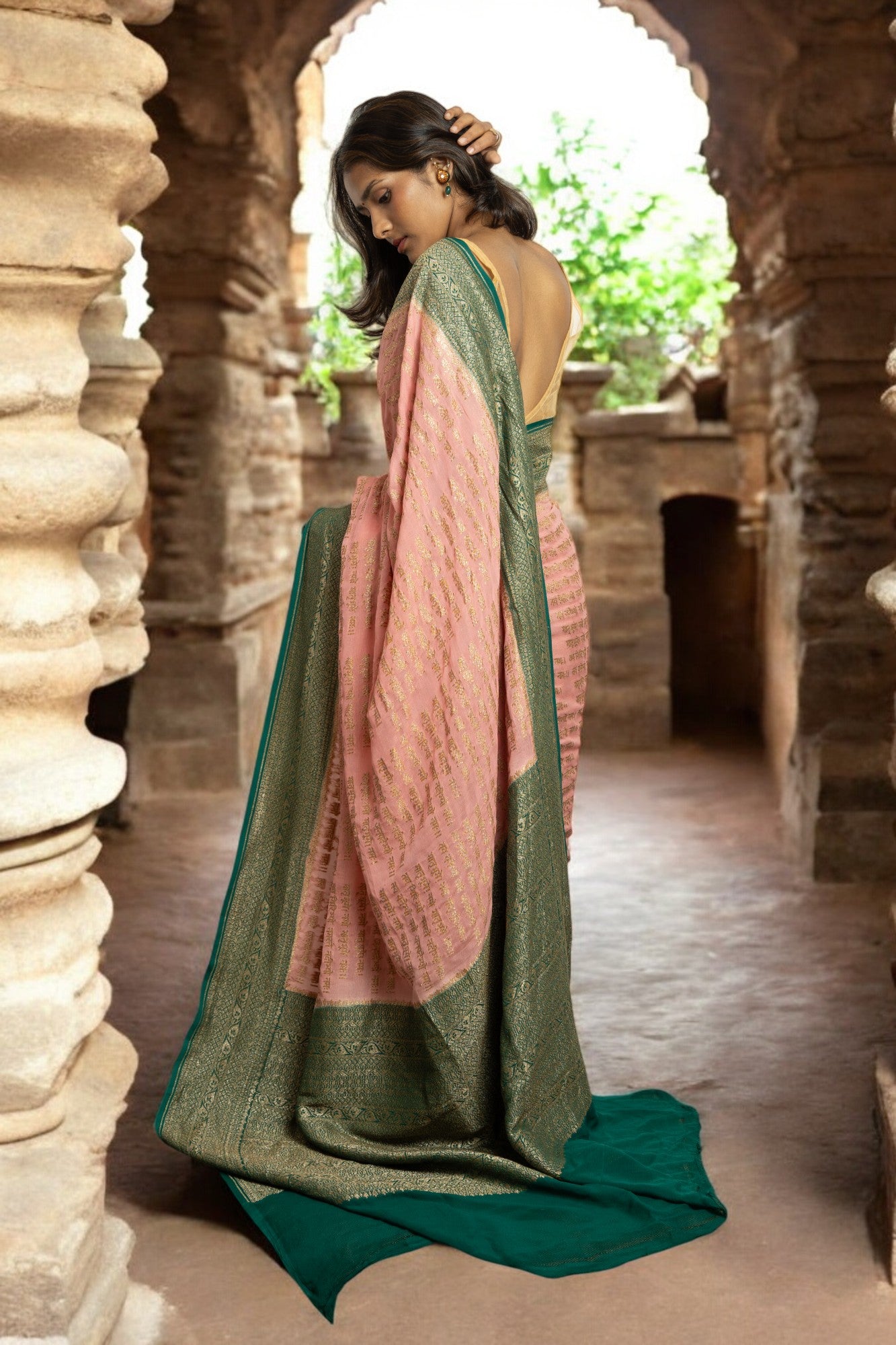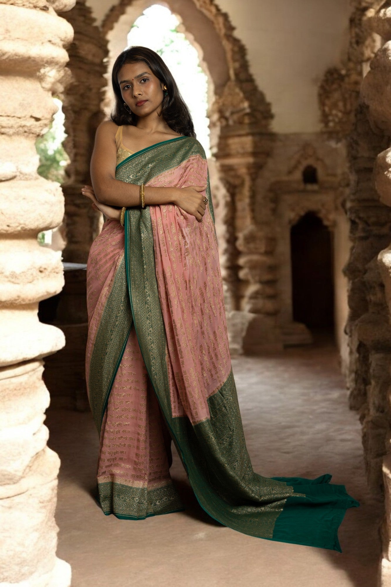 A striking fusion of tradition and thought, this frame-dyed Khaddi Georgette Banarasi saree is woven using the intricate pikkam-pik technique. The body features antique zari-woven scriptures on sustainability and forest preservation over a muddy peach base. A rich emerald green border with Mughal motifs and a beautifully detailed palla complete the look. Paired with a running blouse piece.